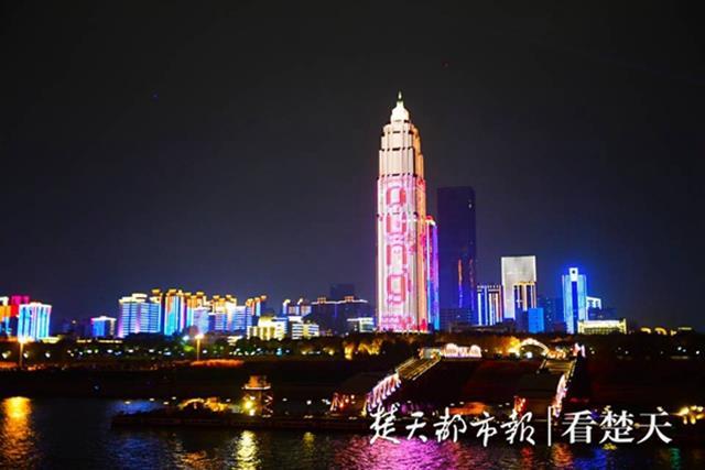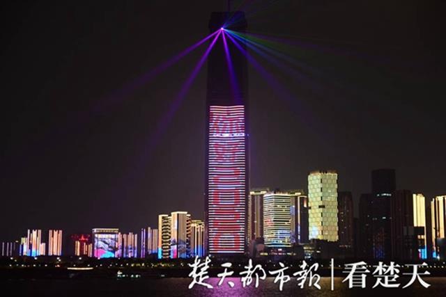 华中第一高楼武汉绿地中心,上演“点亮长江之巅”激光秀,与长江灯光秀交相辉映,照亮大武汉的夜空。